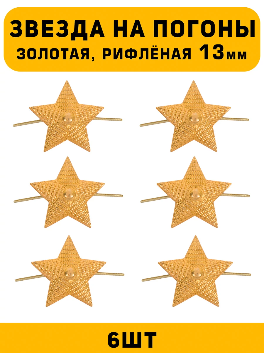 Звезда на погоны 6 шт  размером 13 мм,это элемент специальной униформы которые используют для обозначение звания или отличия. Эти звезды, выполненные в золотом цвете, придают форменной одежде официальный и стильный вид. Независимо от вашего звания — будь то лейтенант, капитан, старший лейтенант или прапорщик — звезда на погоне станет эффектным акцентом.