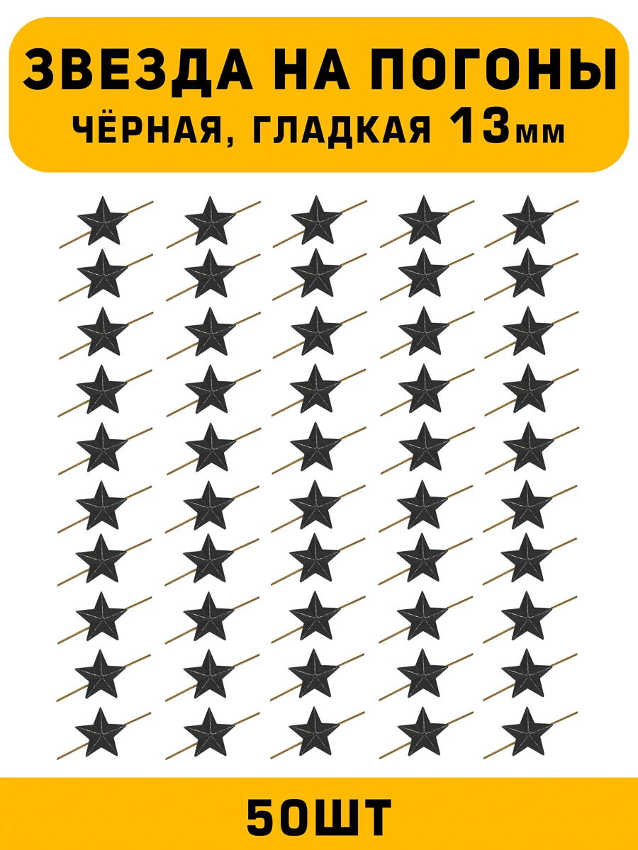 Звезда на погоны 50 шт  размером 13 мм, это элемент специальной униформы которые используют для обозначение звания или отличия. Эти звезды, выполненные в черном цвете, придают форменной одежде официальный и стильный вид. Независимо от вашего звания — будь то лейтенант, капитан, старший лейтенант или прапорщик — звезда на погоне станет эффектным акцентом.
