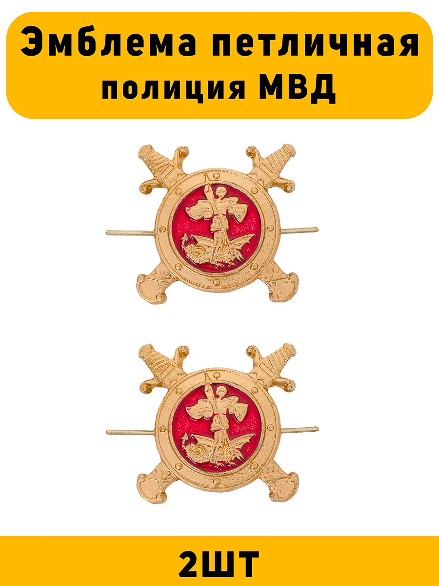 Эмблемы петличные и на погоны МВД (ПОЛИЦИЯ) на форму сотрудников Полиции в виде круглого щита с Георгием Победоносцем на фоне красной эмали с перекрестием мечей. Соответствует Приказу МВД России от 17 ноября 2020 г. N 777 "Об утверждении Правил ношения сотрудниками органов внутренних дел Российской Федерации форменной одежды, знаков различия и ведомственных знаков отличия"