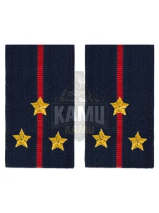 Фальш погоны МВД из темно-синей жаккардовой ткани с полосами и звездами, соответствующими званию Старший лейтенант, вышитыми прочными нитками темно-золотистого цвета. 100% полиэстер. Размеры 9 см на 5 см.