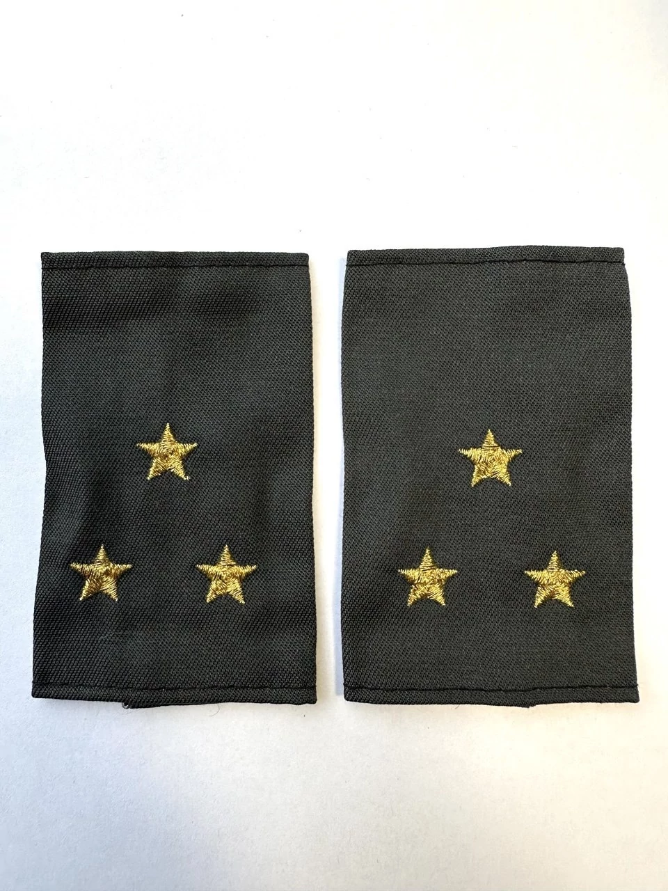 Фальш погоны МВД из жаккардовой ткани с звездами, соответствующими званию Старший лейтенант, вышитыми прочными нитками золотистого цвета. 100% полиэстер. Размеры 9 см на 5 см.