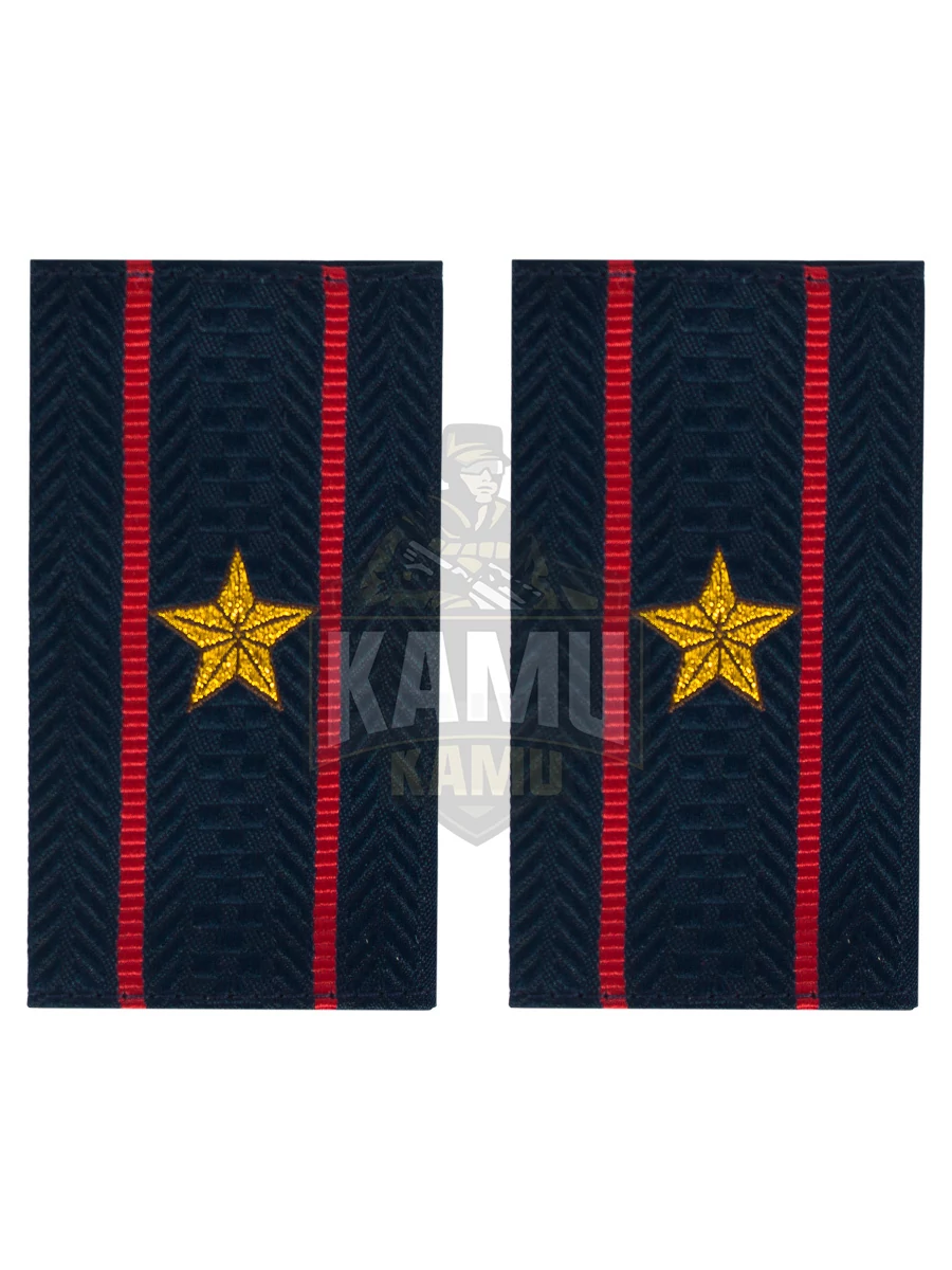 Фальш погоны МВД из темно-синей жаккардовой ткани с полосами и звездой, соответствующими званию Майор, вышитыми прочными нитками темно-золотистого цвета. 100% полиэстер. Размеры 9 см на 5 см.