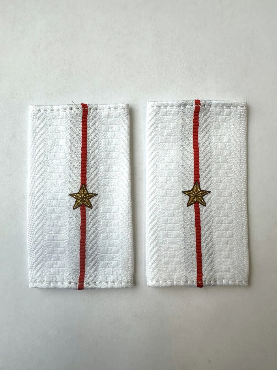 Фальш погоны МВД белые Младший лейтенант из жаккардовой ткани с полосами и звездами, соответствующими званию, вышитыми прочными нитками темно-золотистого цвета. 100% полиэстер. Размеры 9 см на 5 см.