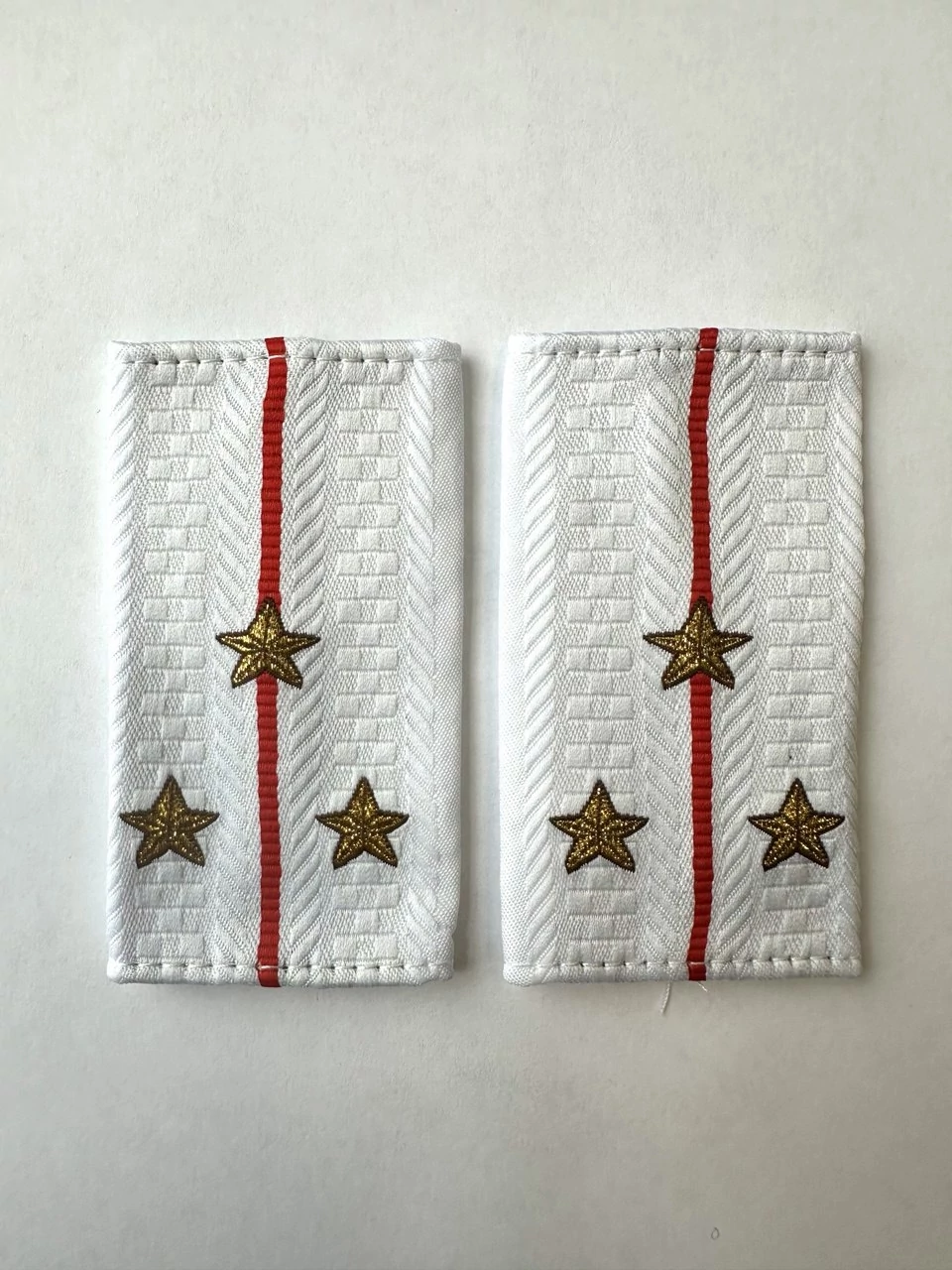 Фальш погоны МВД белые Старший лейтенант из жаккардовой ткани с полосами и звездами, соответствующими званию, вышитыми прочными нитками темно-золотистого цвета. 100% полиэстер. Размеры 9 см на 5 см.