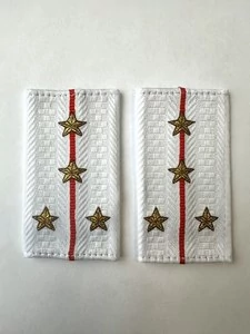Фальш погоны МВД белые Капитан из жаккардовой ткани с полосами и звездами, соответствующими званию, вышитыми прочными нитками темно-золотистого цвета. 100% полиэстер. Размеры 9 см на 5 см.
