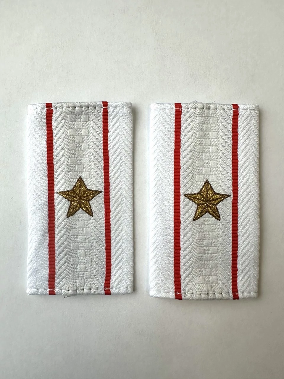 Фальш погоны МВД белые Майор из жаккардовой ткани с полосами и звездами, соответствующими званию, вышитыми прочными нитками темно-золотистого цвета. 100% полиэстер. Размеры 9 см на 5 см.