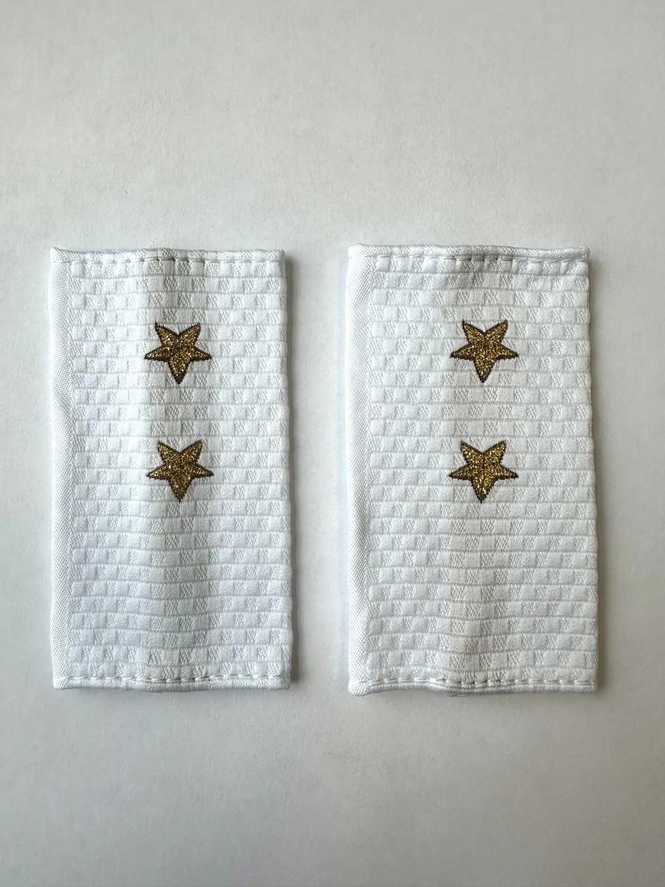 Фальш погоны МВД белые Прапорщик из жаккардовой ткани с полосами и звездами, соответствующими званию, вышитыми прочными нитками темно-золотистого цвета. 100% полиэстер. Размеры 9 см на 5 см.