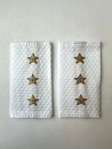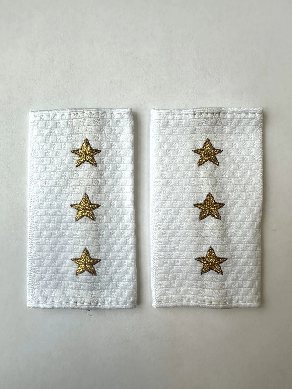 Фальш погоны МВД белые Старший Прапорщик из жаккардовой ткани с полосами и звездами, соответствующими званию, вышитыми прочными нитками темно-золотистого цвета. 100% полиэстер. Размеры 9 см на 5 см.