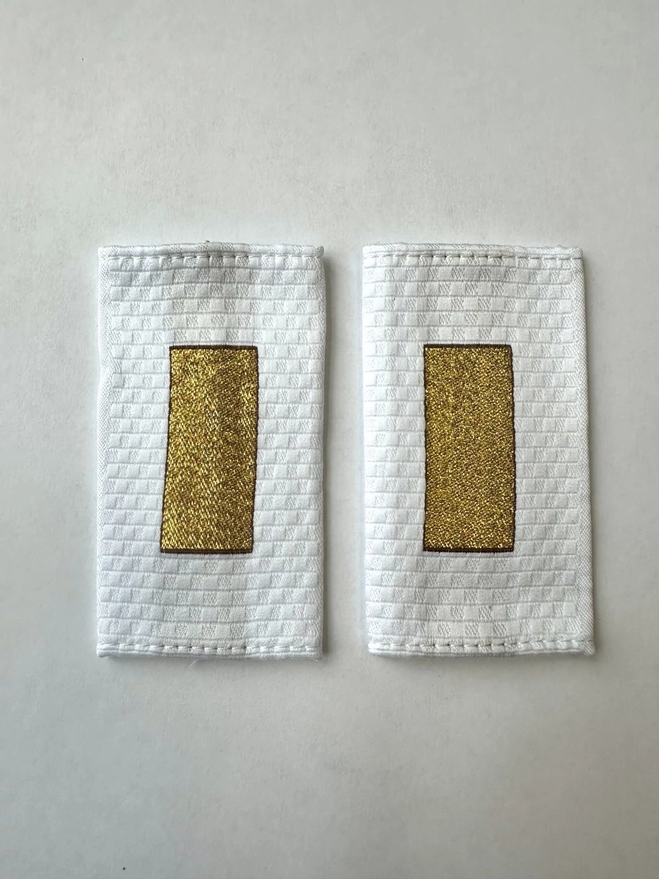 Фальш погоны МВД белые Старшина из жаккардовой ткани с полосами и звездами, соответствующими званию, вышитыми прочными нитками темно-золотистого цвета. 100% полиэстер. Размеры 9 см на 5 см.
