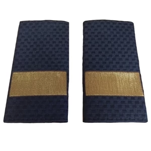 Фальш погоны МВД из темно-синей жаккардовой ткани с полосами, соответствующими званию Старший сержант, вышитыми прочными нитками темно-золотистого цвета. 100% полиэстер. Размеры 9 см на 5 см.