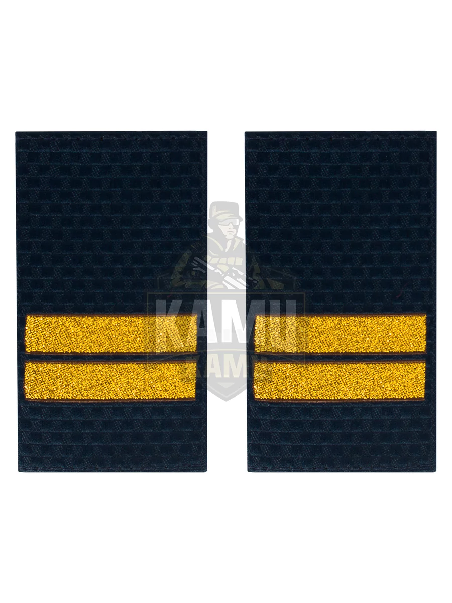 Фальш погоны МВД из темно-синей жаккардовой ткани с полосами, соответствующими званию Младший сержант, вышитыми прочными нитками темно-золотистого цвета.