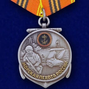 Медаль "310 лет Морской пехоте" Медаль "310 лет Морской пехоте" из латуни. Колодка - пятиугольная, крепление - булавочный зажим. Характеристики Номер изделия по каталогу 161 Медаль "310 лет Морской пехоте" Медаль "310 лет Морской пехоте" из латуни. Колодка - пятиугольная, крепление - булавочный зажим. Положение о медали «310 лет Морской пехоте» Указ о создании первого полка морской пехоты датируется 1705 годом, а его авторство принадлежит Петру Первому. День Морской пехоты в РФ приурочен к факту утверждения приказа Главкома ВМФ РФ от 19 ноября 1995г в память об указе Петра I, который и был инициатором создания «полка морских солдат». Указу предшествовал бой со шведами в ноябре 1705 года. Дата 27 ноября 1705 года считается днем рождения регулярной морской пехоты РФ. К этому значительному событию приурочена и юбилейная медаль Морской пехоты. Современные подразделения морской пехоты России принимали участие в сражениях и военных конфликтах практически по всему земному шару: Сирия, Ливан, Иран, Ирак, Афганистан, Сомали, Ангола, Вьетнам, Грузия, Дагестан, Чечня и др. Медаль «310 лет Морской пехоте» полагается: Личному составу ВС, срок службы представителей которого в органах управления береговыми военными подразделениями ВМФ превышает 5 лет; Военнослужащим, исправно несшим и исполнявшим свой воинский долг; Лицам, уволенным в запас, и ветеранам.-