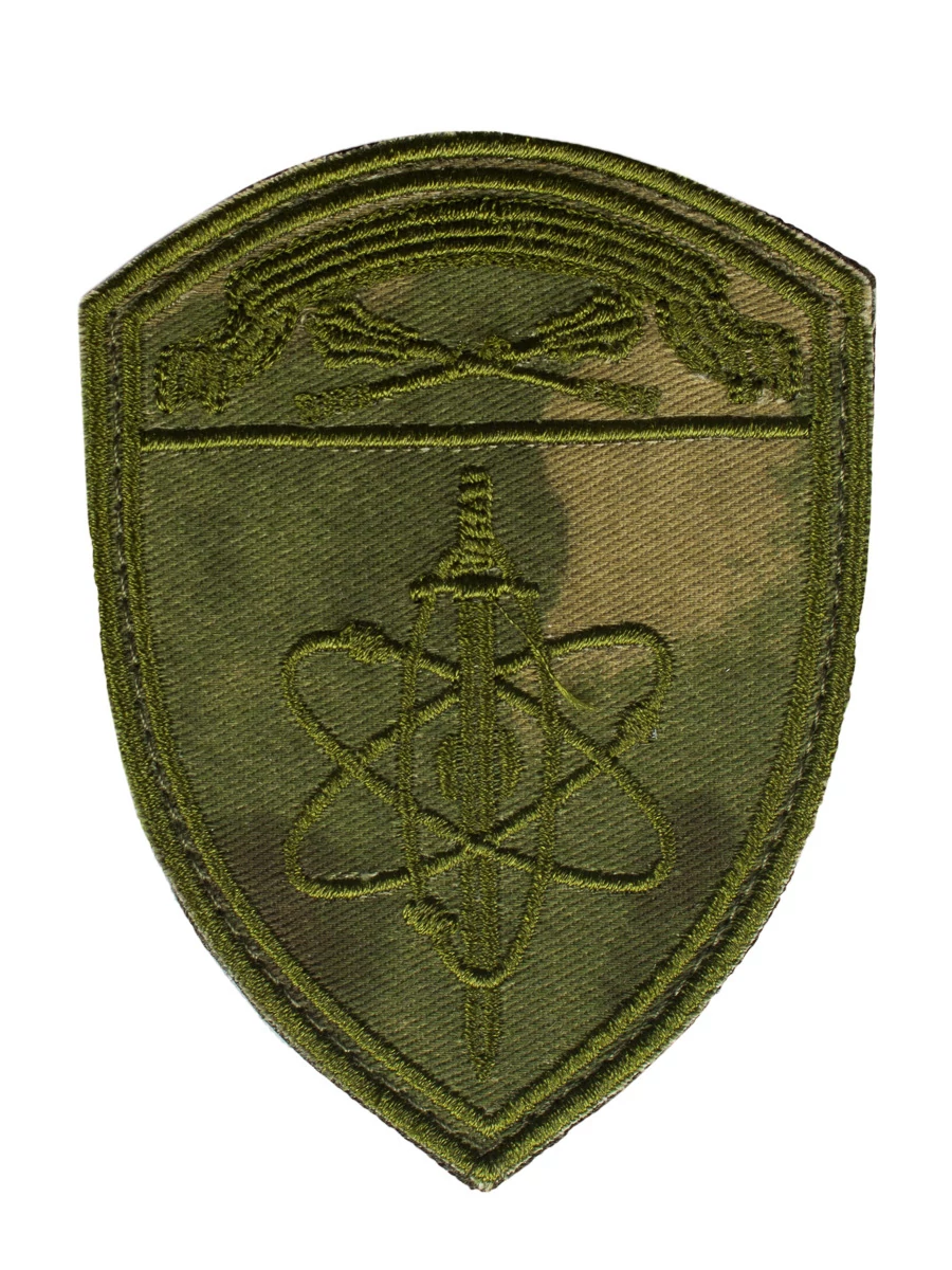 Шеврон Федеральной Службы Войск Национальной Гвардии Российской Федерации (ФС ВНГ РФ / РОСГВАРДИЯ), вышитый на оливковом фоне оливковыми нитками «ВГО и СГ - ОХРАНЕ ВАЖНЫХ ГОСУДАРСТВЕННЫХ ОБЪЕКТОВ И СПЕЦИАЛЬНЫХ ГРУЗОВ меч и атомы», на правый рукав. Цвет оливковый.