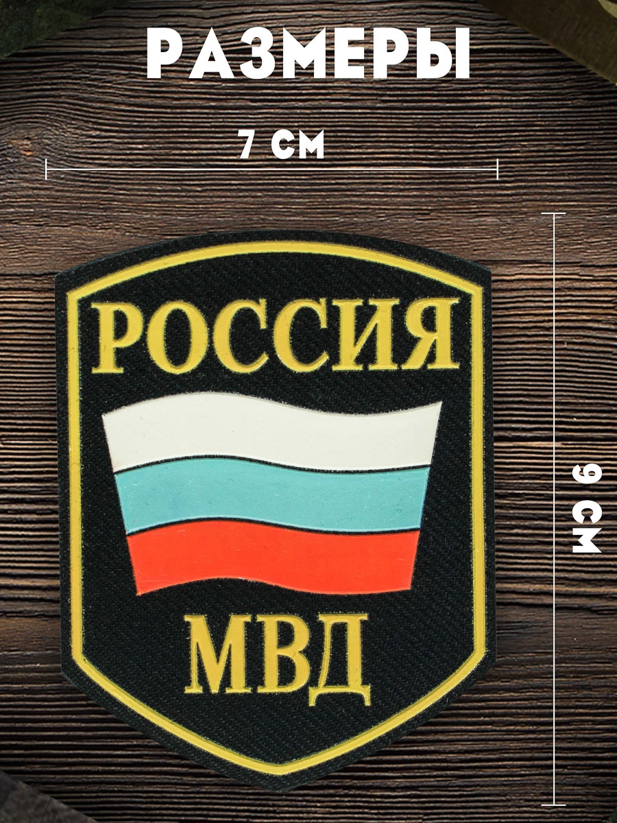 Нашивка на рукав Россия МВД. Шеврон МВД Россия старого образца с нанесением пластизоли не имеет липучки Велкро. Размер 9х7 см.