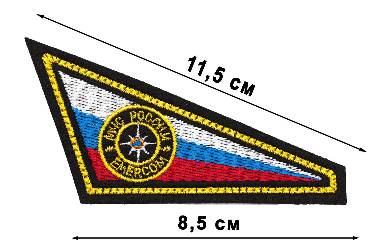 Вышитый уголок с эмблемой МЧС на фоне триколора России. Высококачественная машинная вышивка. Нашивка уголок на берет МЧС России с желтым кантом.