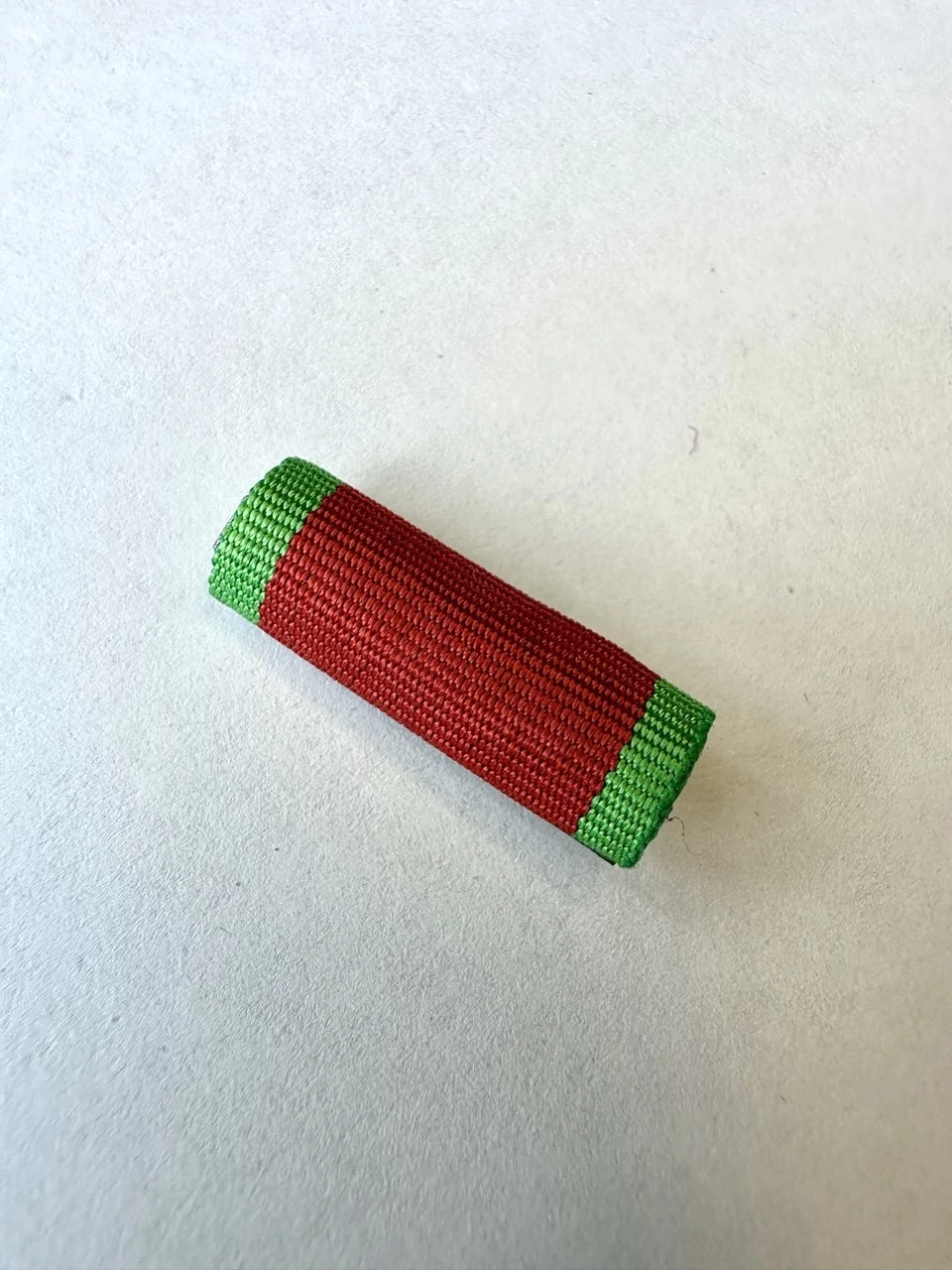 Орденская планка к медали Суворова на булавке на булавке, представляет собой обтянутую орденской лентой прямоугольную подложку. Планки на металлической основе крепятся на булавку, которая имеется на обратной стороне.