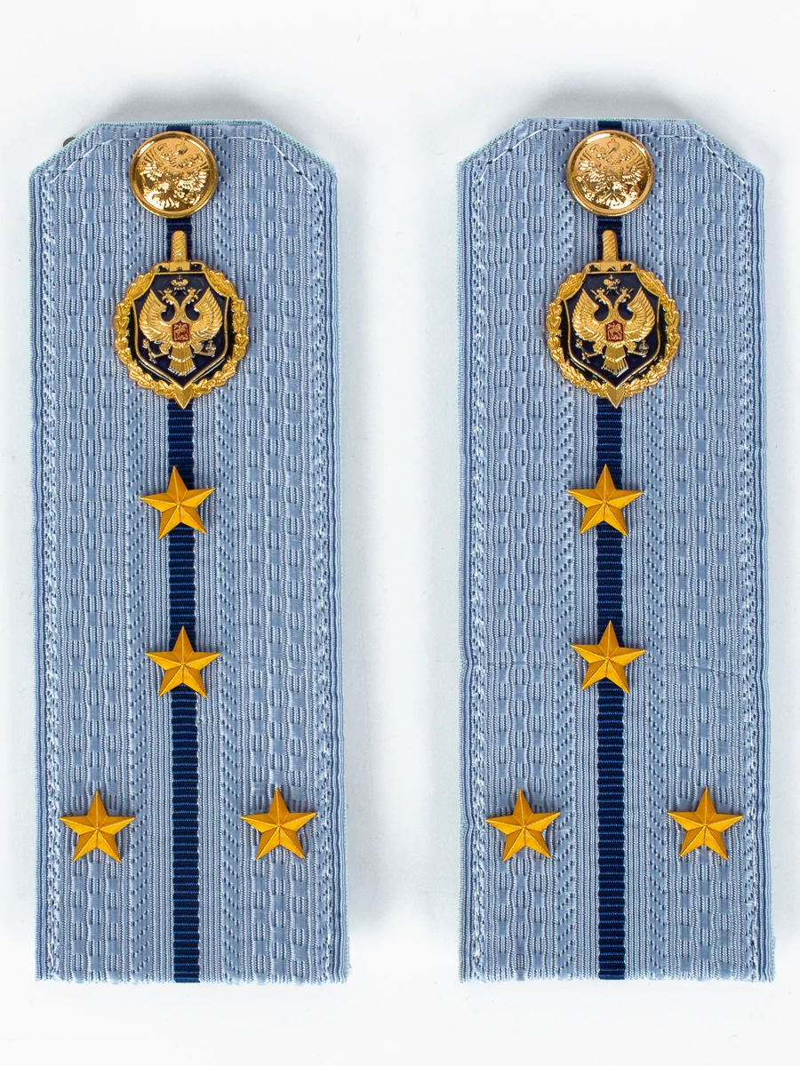Погоны ФСБ голубые на рубашку, звание Капитан 14х5см картон (реквизит). Размер 14 см на 5,5 см. Толщина 1 мм. Погоны ФСБ ткань жаккард с синим просветом на картонной основе. Погоны идут сразу в сборе с металлической фурнитурой из латуни и застежкой кляммером. При креплении жестких погон необходимо использовать застежку-кляймер. Необходимо продеть ленту погона в специальные петли на уставной форме.
