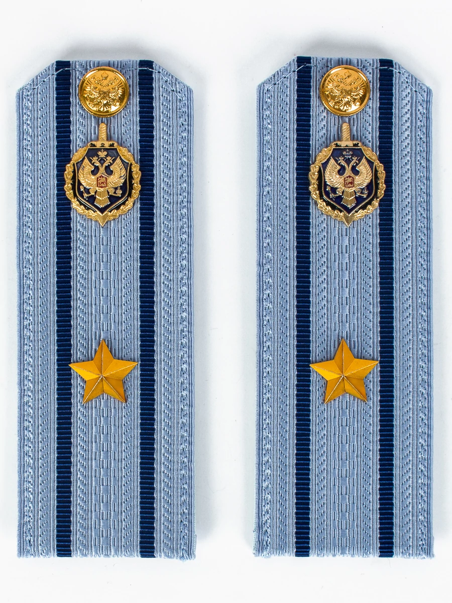 Погоны ФСБ голубые на рубашку, звание Майор 14х5см пластик (реквизит). Размер 14 см на 5,5 см. Толщина 1 мм. Погоны ФСБ ткань жаккард с синим просветом на пластиковой основе. Погоны идут сразу в сборе с металлической фурнитурой из латуни и застежкой кляммером. При креплении жестких погон необходимо использовать застежку-кляймер. Необходимо продеть ленту погона в специальные петли на уставной форме.