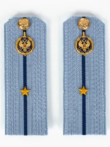 Погоны ФСБ голубые на рубашку, звание Младший лейтенант. Размер 14 см. Погоны ФСБ ткань жаккард с синим просветом на пластиковой основе. Погоны идут сразу в сборе с металлической фурнитурой из латуни и застежкой кляммером. При креплении жестких погон необходимо использовать застежку-кляймер. Необходимо продеть ленту погона в специальные петли на уставной форме.