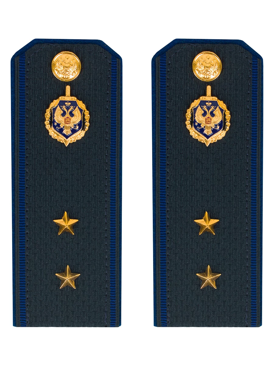 Размер 14 см на 5,5 см. Толщина 1 мм. Погоны ФСБ ткань жаккард темно-синего цвета с синим просветом на картонной основе. Погоны идут сразу в сборе с металлической фурнитурой из латуни и застежкой кляммером. При креплении жестких погон необходимо использовать застежку-кляймер. Необходимо продеть ленту погона в специальные петли на уставной форме.