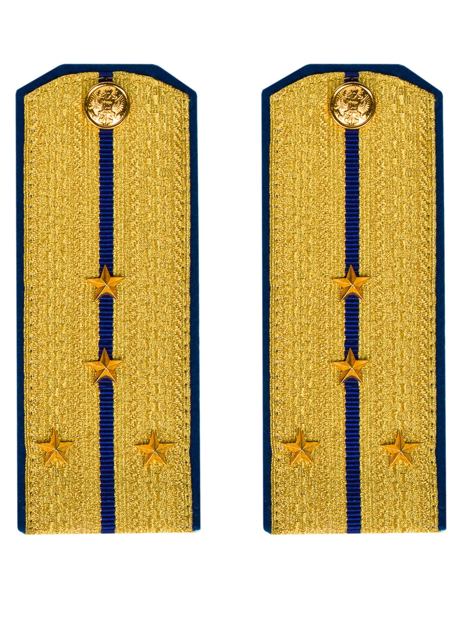 Погоны парадные ФСБ золотые картон звание Капитан размер 14 см на 5,5 см. Толщина 1 мм. Погоны ФСБ ткань жаккард золотого цвета с синим просветом на картонной основе. Погоны идут сразу в сборе с металлической фурнитурой из латуни и застежкой кляммером. При креплении жестких погон необходимо использовать застежку-кляймер. Необходимо продеть ленту погона в специальные петли на уставной форме.