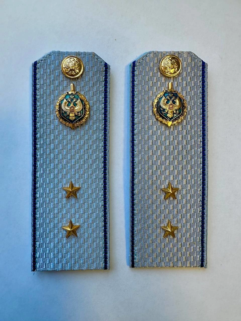 Размер 14 см на 5 см. Толщина 1 мм. Погоны ФСБ ткань жаккард голубого цвета на картонной основе. Погоны идут сразу в сборе с металлической фурнитурой из латуни и застежкой кляммером. При креплении жестких погон необходимо использовать застежку-кляймер. Необходимо продеть ленту погона в специальные петли на уставной форме.