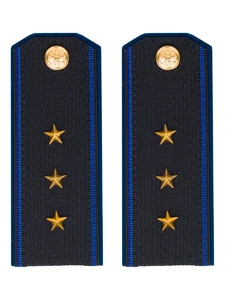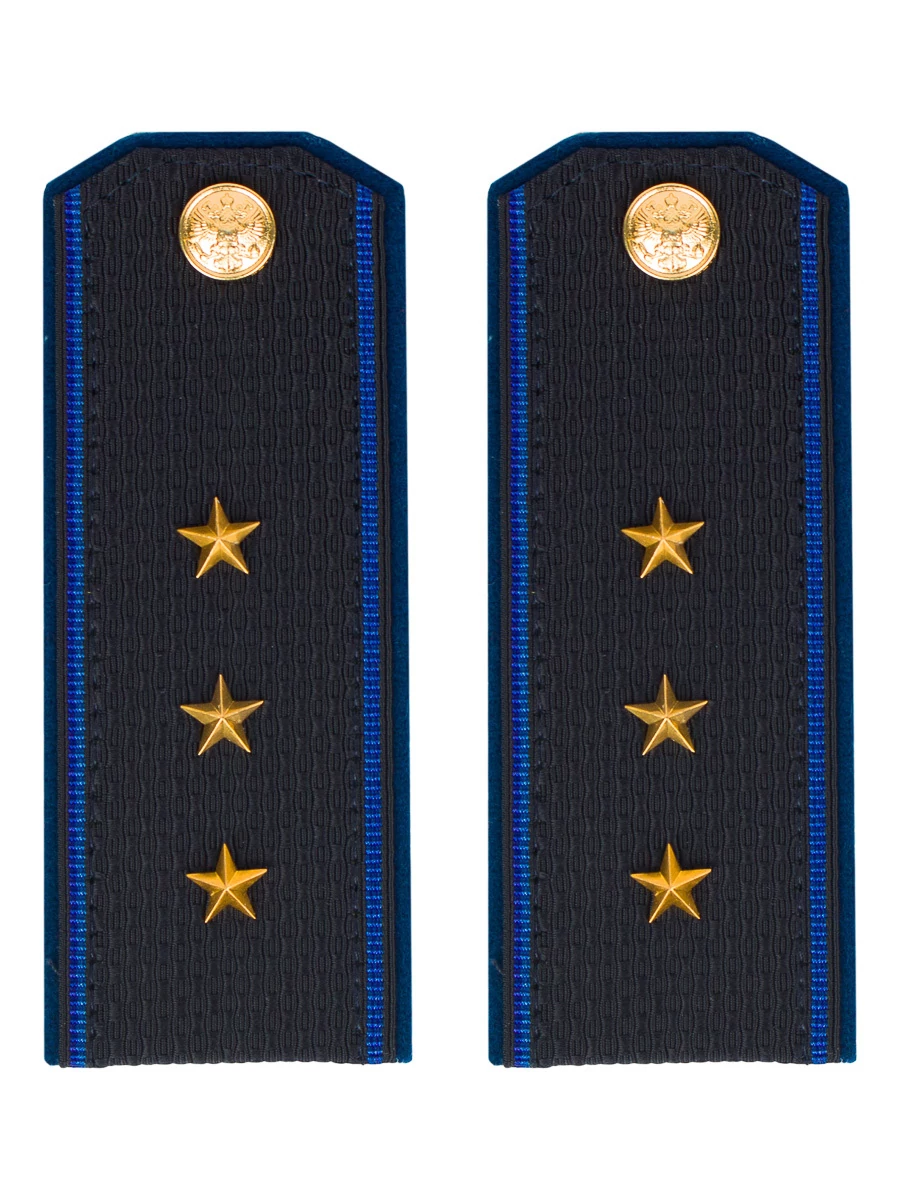 Размер 14 см на 5 см. Толщина 1 мм. Погоны ФСБ ткань жаккард темно-синего цвета с синим просветом на картонной основе. Погоны идут сразу в сборе с металлической фурнитурой из латуни и застежкой кляммером. При креплении жестких погон необходимо использовать застежку-кляймер. Необходимо продеть ленту погона в специальные петли на уставной форме.