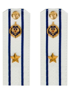 Размер 14 см на 5,5 см. Толщина 1 мм. Погоны ФСБ ткань жаккард белого цвета с синим просветом на картонной основе. Погоны идут сразу в сборе с металлической фурнитурой из латуни и застежкой кляммером. При креплении жестких погон необходимо использовать застежку-кляймер. Необходимо продеть ленту погона в специальные петли на уставной форме.