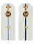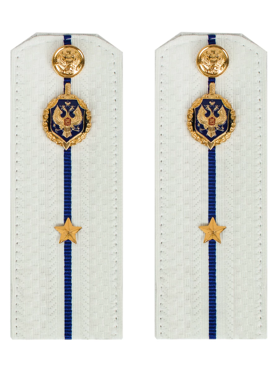 Размер 14 см на 5,5 см. Толщина 1 мм. Погоны ФСБ ткань жаккард белого цвета с синим просветом на картонной основе. Погоны идут сразу в сборе с металлической фурнитурой из латуни и застежкой кляммером. При креплении жестких погон необходимо использовать застежку-кляймер. Необходимо продеть ленту погона в специальные петли на уставной форме.
