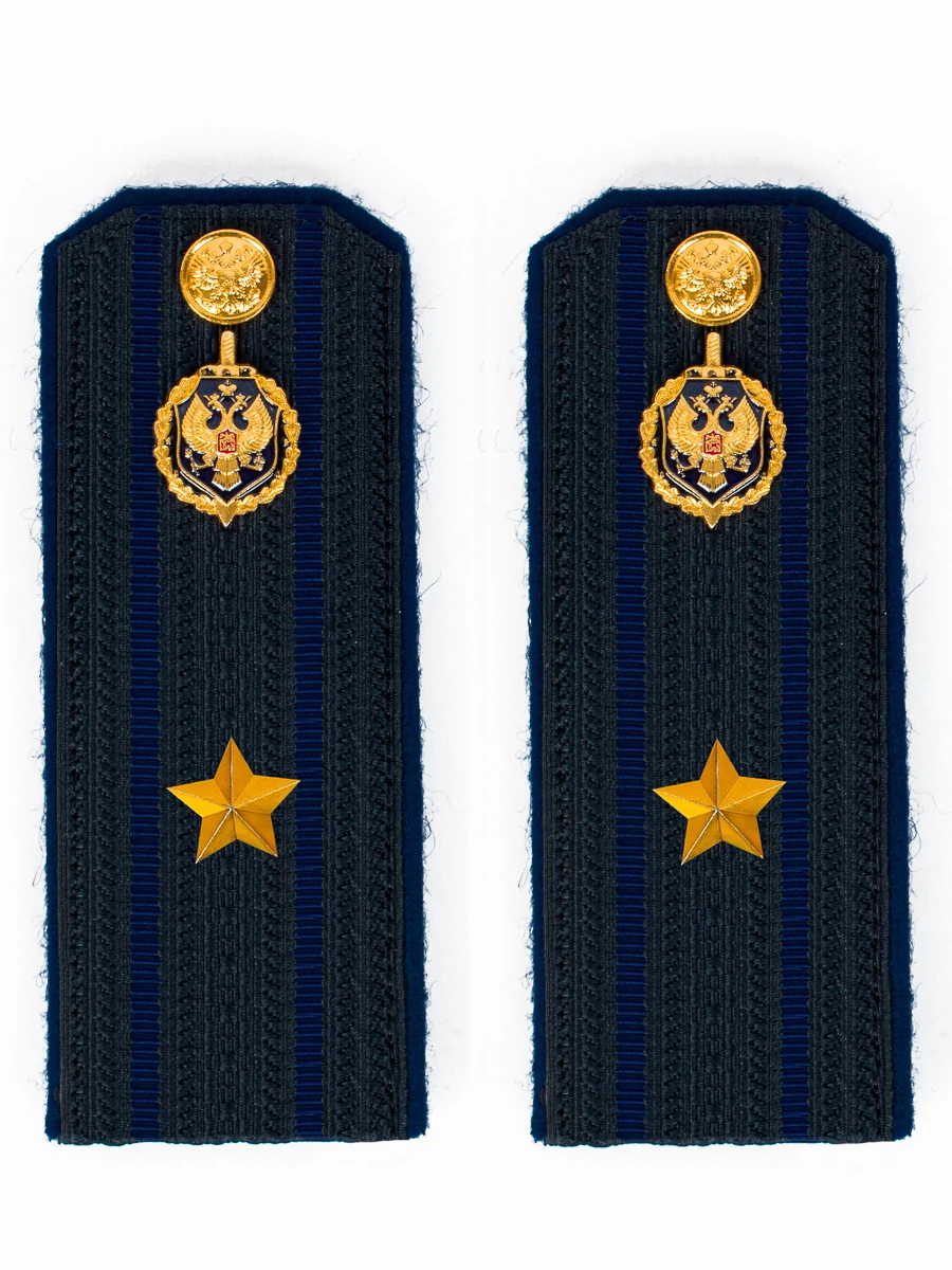 Размер 14 см на 5,5 см. Толщина 1 мм. Погоны ФСБ ткань жаккард с синим просветом на картонной основе. Погоны идут сразу в сборе с металлической фурнитурой из латуни и застежкой кляммером. При креплении жестких погон необходимо использовать застежку-кляймер. Необходимо продеть ленту погона в специальные петли на уставной форме.