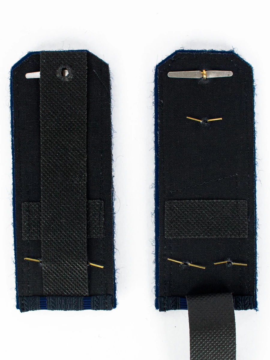 Размер 14 см на 5,5 см. Толщина 1 мм. Погоны ФСБ ткань жаккард с синим просветом на картонной основе. Погоны идут сразу в сборе с металлической фурнитурой из латуни и застежкой кляммером. При креплении жестких погон необходимо использовать застежку-кляймер. Необходимо продеть ленту погона в специальные петли на уставной форме.