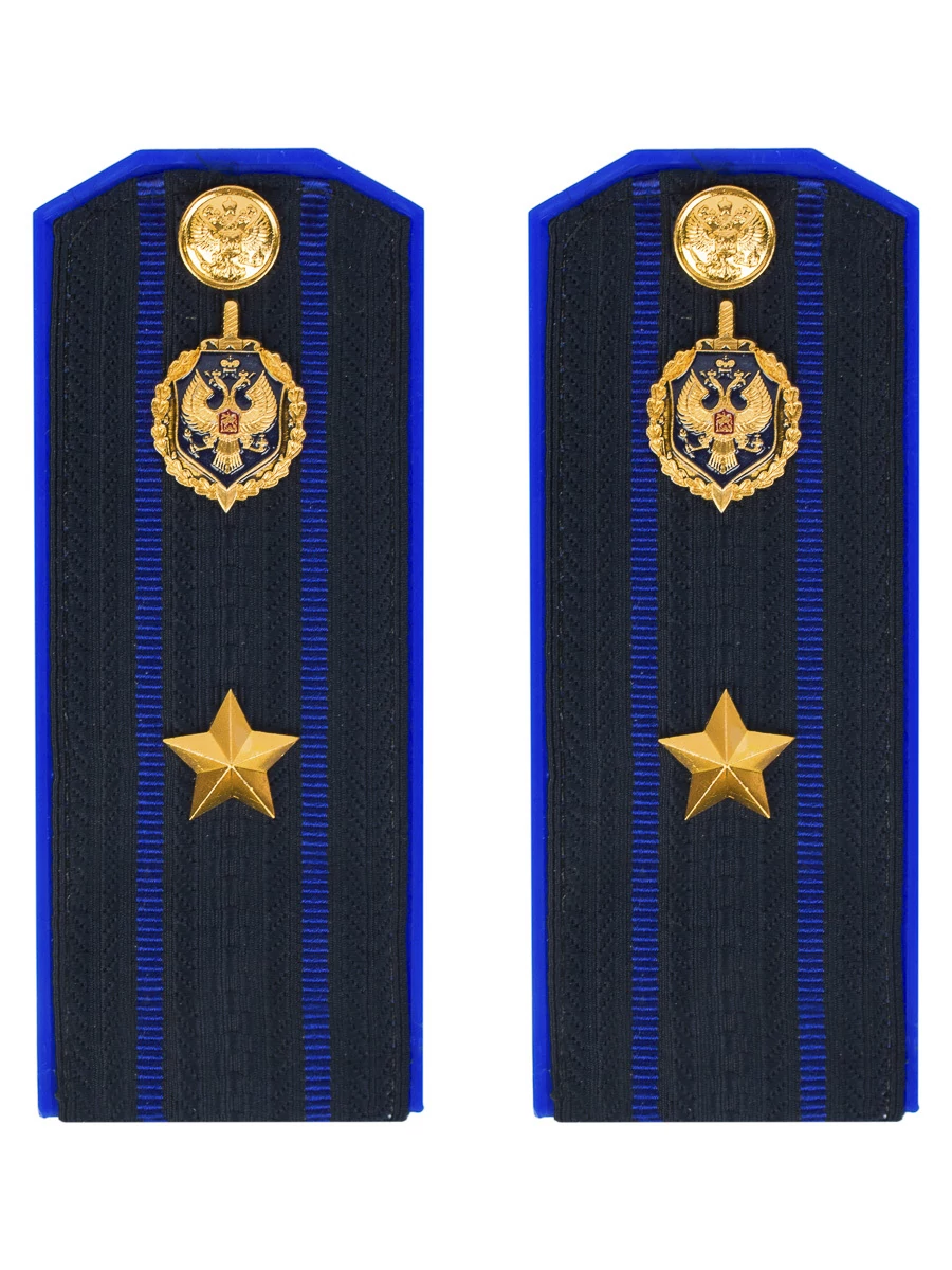 Размер 14 см на 5,5 см. Толщина 1 мм. Погоны ФСБ ткань жаккард темно-синего цвета с зеленым просветом на пластиковой основе. Погоны идут сразу в сборе с металлической фурнитурой из латуни и застежкой кляммером. При креплении жестких погон необходимо использовать застежку-кляймер. Необходимо продеть ленту погона в специальные петли на уставной форме.