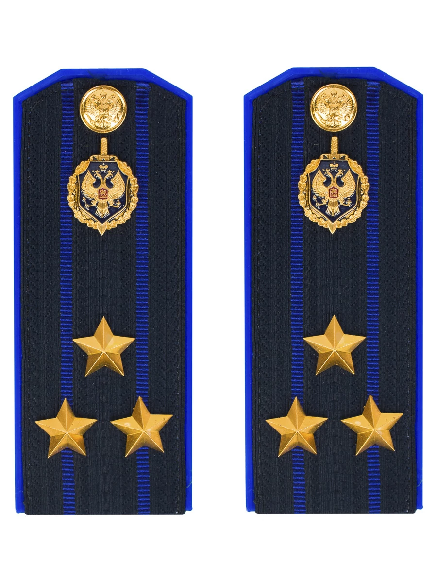 Размер 14 см на 5,5 см. Толщина 1 мм. Погоны ФСБ ткань жаккард темно-синего цвета с зеленым просветом на пластиковой основе. Погоны идут сразу в сборе с металлической фурнитурой из латуни и застежкой кляммером. При креплении жестких погон необходимо использовать застежку-кляймер. Необходимо продеть ленту погона в специальные петли на уставной форме.