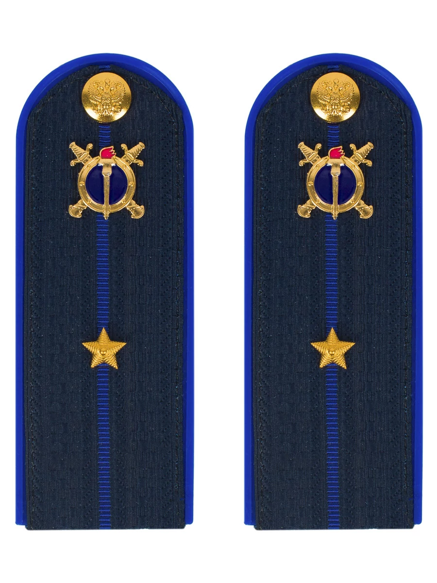 Размер 14 см на 5,5 см. Толщина 1 мм. Погоны Юстиции ткань жаккард темно-синего цвета с синим просветом на пластиковой основе. Погоны идут сразу в сборе с металлической фурнитурой из латуни и застежкой кляммером. При креплении жестких погон необходимо использовать застежку-кляймер. Необходимо продеть ленту погона в специальные петли на уставной форме.