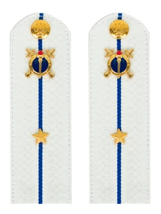 Размер 14 см на 5,5 см. Толщина 1 мм. Погоны Юстиции ткань жаккард белого цвета с синим просветом на картонной основе. Погоны идут сразу в сборе с металлической фурнитурой из латуни и застежкой кляммером. При креплении жестких погон необходимо использовать застежку-кляймер. Необходимо продеть ленту погона в специальные петли на уставной форме.