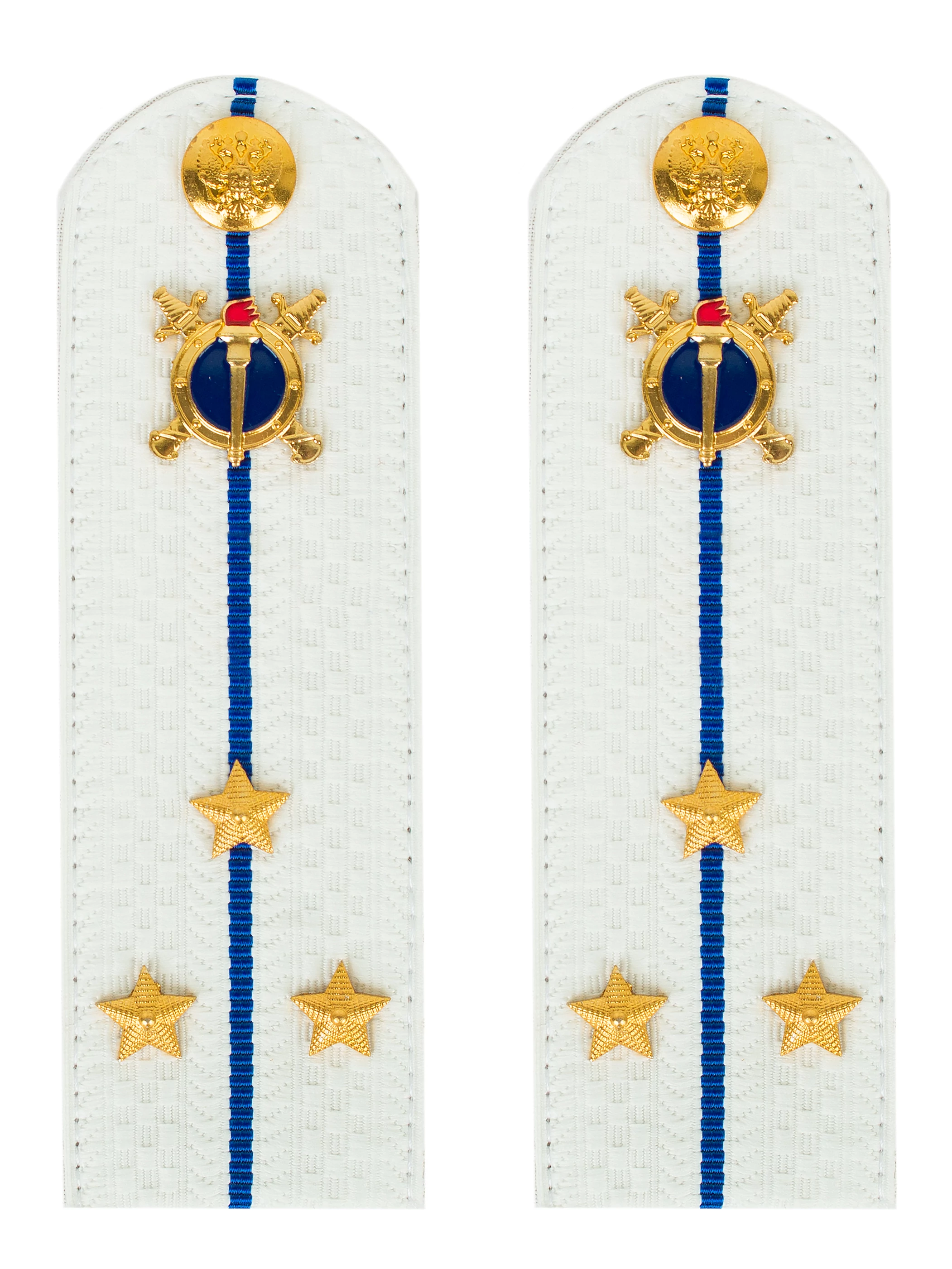 Размер 14 см на 5,5 см. Толщина 1 мм. Погоны Юстиции ткань жаккард белого цвета с синим просветом на картонной основе. Погоны идут сразу в сборе с металлической фурнитурой из латуни и застежкой кляммером. При креплении жестких погон необходимо использовать застежку-кляймер. Необходимо продеть ленту погона в специальные петли на уставной форме.