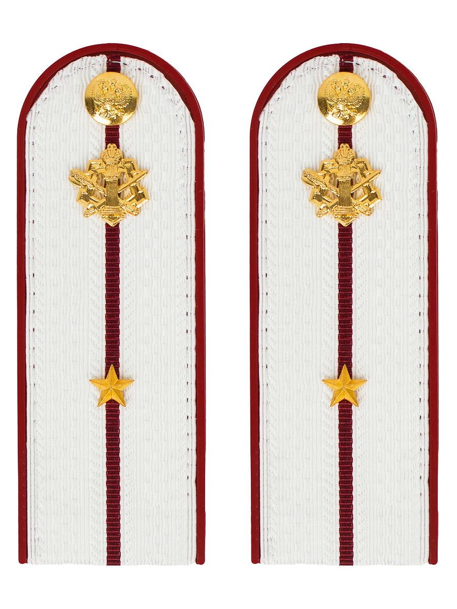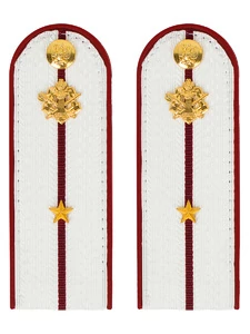 Размер 14 см на 5,5 см. Толщина 1 мм. Погоны ФСИН ткань жаккард белого цвета с красным просветом на пластиковой основе. Погоны идут сразу в сборе с металлической фурнитурой из латуни и застежкой кляммером. При креплении жестких погон необходимо использовать застежку-кляймер. Необходимо продеть ленту погона в специальные петли на уставной форме.