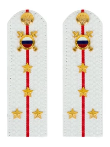 Размер 13,5 см на 4,5 см. Толщина 1 мм. Погоны МВД белые ткань жаккард белого цвета, основа пластик. Погоны идут сразу в сборе с металлической фурнитурой из латуни и застежкой кляммером. При креплении жестких погон необходимо использовать застежку-кляймер. Необходимо продеть ленту погона в специальные петли на уставной форме.
