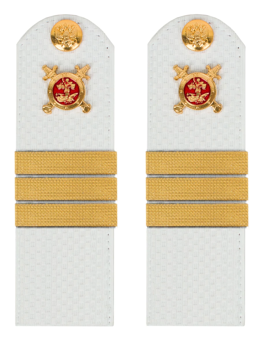 Размер 13,5 см на 4,5 см. Толщина 1 мм. Погоны МВД белые ткань жаккард белого цвета, основа картон. Погоны идут сразу в сборе с металлической фурнитурой из латуни и застежкой кляммером. При креплении жестких погон необходимо использовать застежку-кляймер. Необходимо продеть ленту погона в специальные петли на уставной форме.