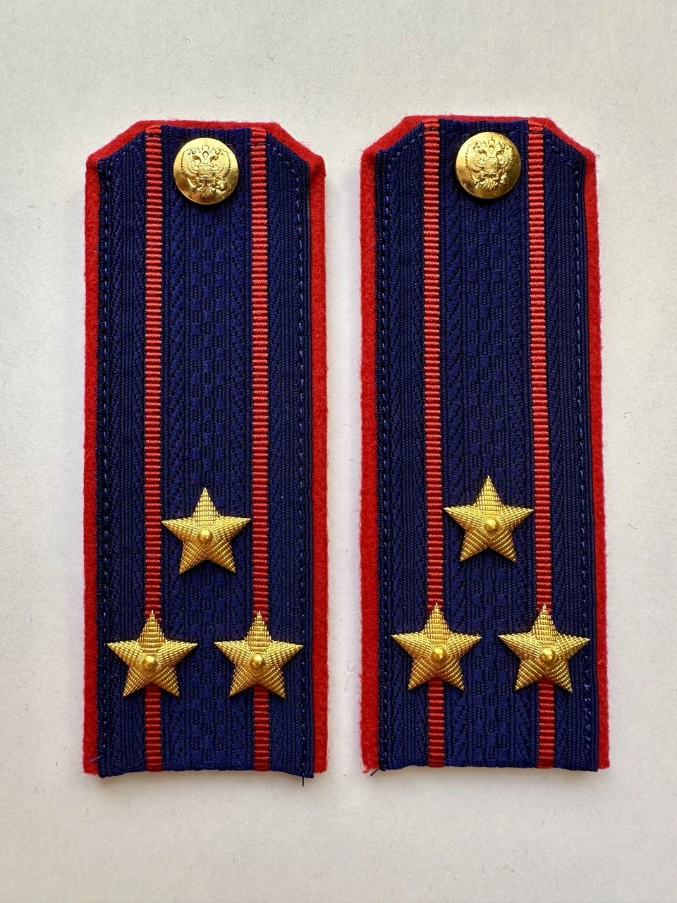 Размер 14 см на 5 см. Погоны Следственный комитет синие ткань жаккард темно-синего цвета, основа картон. Погоны идут сразу в сборе с металлической фурнитурой из латуни и застежкой кляммером. При креплении жестких погон необходимо использовать застежку-кляймер. Необходимо продеть ленту погона в специальные петли на уставной форме.