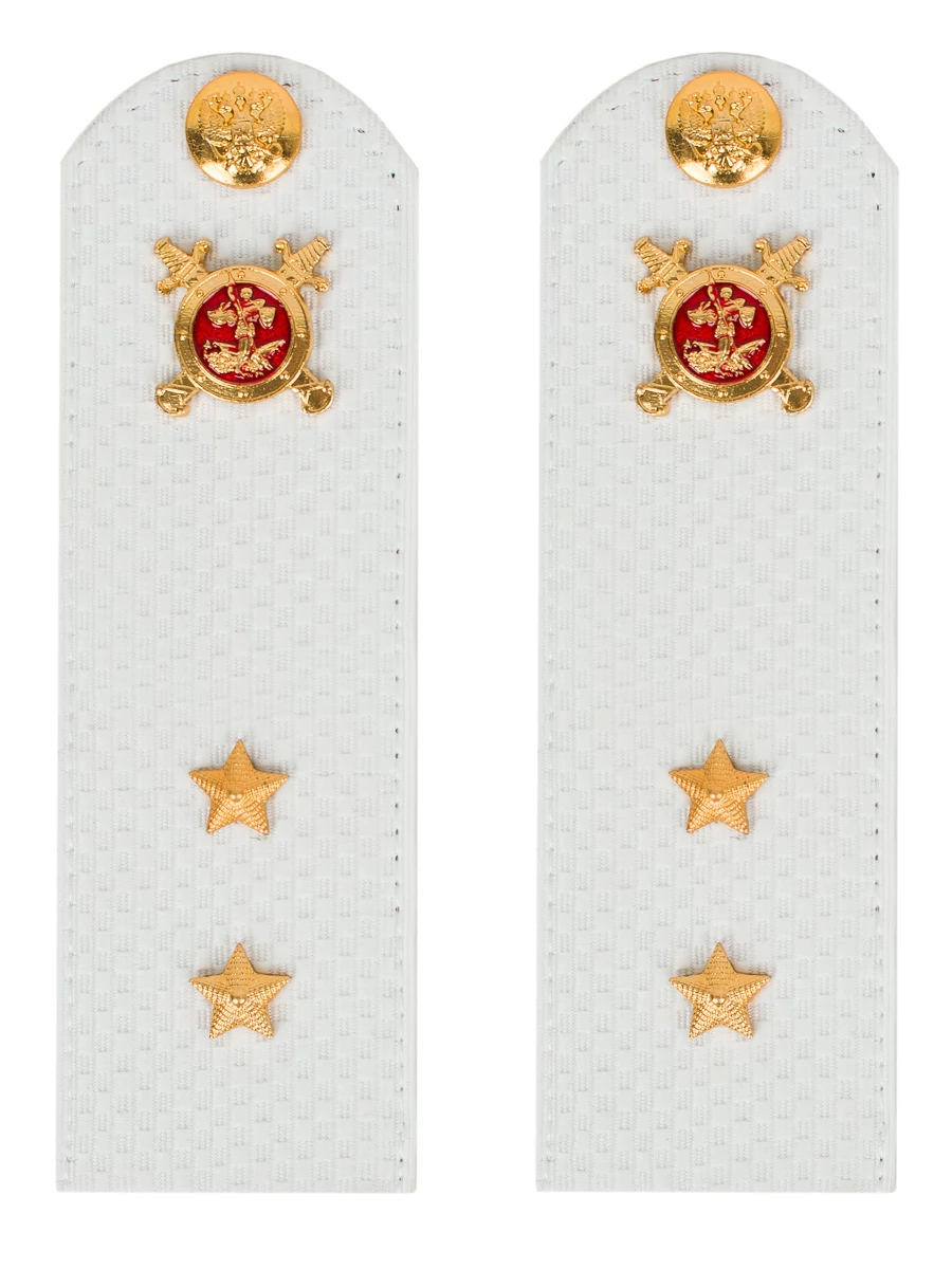 Погоны МВД белые ткань жаккард белого цвета, основа картон. Погоны идут сразу в сборе с металлической фурнитурой из латуни и застежкой кляммером. При креплении жестких погон необходимо использовать застежку-кляймер. Необходимо продеть ленту погона в специальные петли на уставной форме.