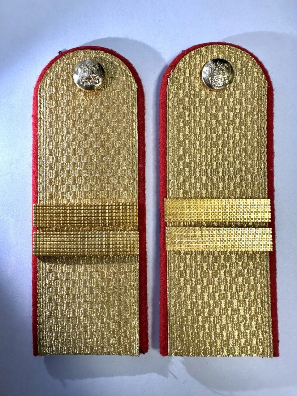 Погоны МВД ткань жакард золотого цвета, основа картон. Погоны идут сразу в сборе с металлической фурнитурой из латуни и застежкой кляммером. При креплении жестких погон необходимо использовать застежку-кляймер.