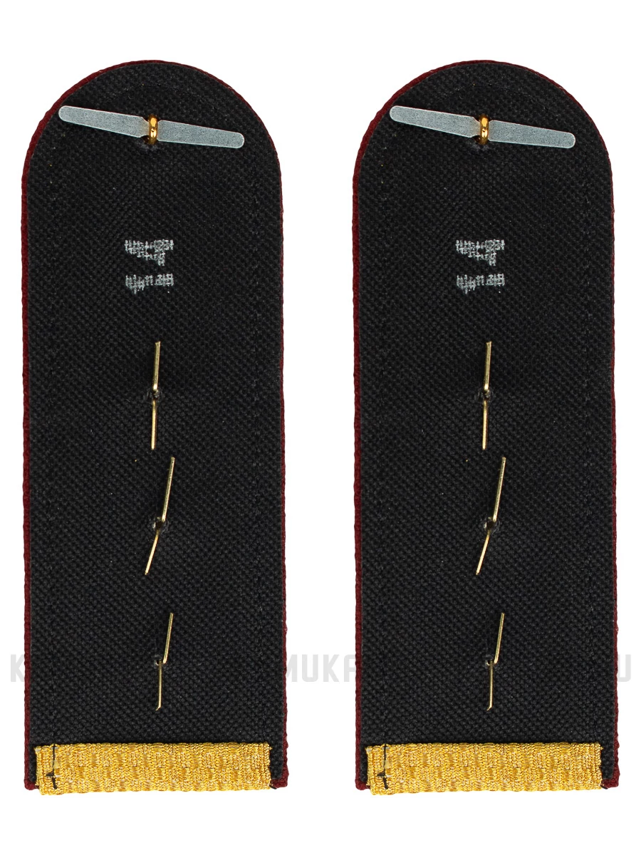 Погоны ФСИН парадные Лейтенант картон цвет золотой, Размер 13см (реквизит). Погоны ФСИН ткань жаккард золотого цвета с красным просветом на картонной основе. Погоны идут сразу в сборе с металлической фурнитурой из латуни и застежкой кляммером. При креплении жестких погон необходимо использовать застежку-кляймер. Необходимо продеть ленту погона в специальные петли на уставной форме.