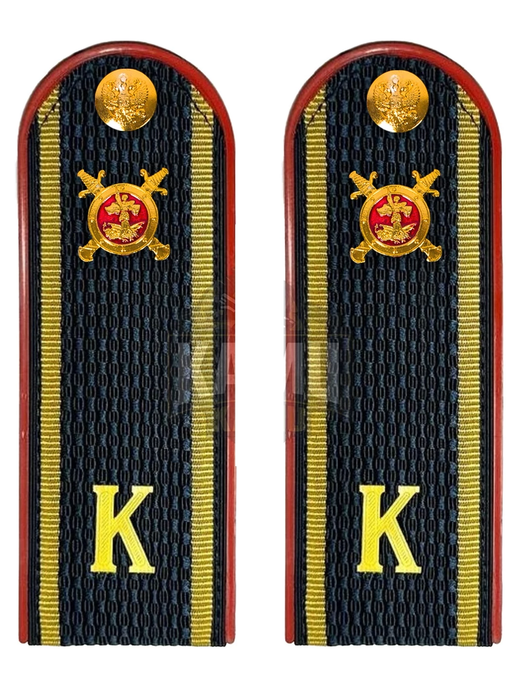 Размер 14 на 5 см. Погоны полиции К курсантские изготовлены в форме прямоугольника, верхние края которого закруглены. Подложка выполнена из пластика, который защищает изделия от деформации во время носки. Для крепления погон к форме на изнаночной стороне пришита шлевка из ткани. Лицевая поверхность обстрочена красивым тонким шелковым галуном темно-синего цвета. Пластик красного цвета. Кадетская и курсантская форма.