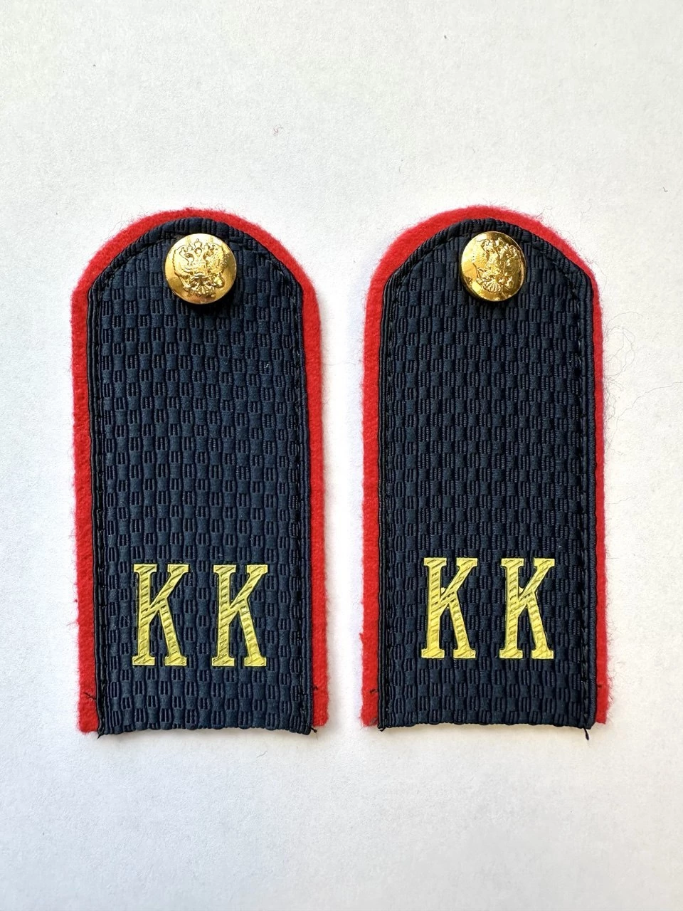 Размер 10,5 на 5 см. Погоны полиции КК кадетские изготовлены в форме прямоугольника, верхние края которого закруглены. Подложка выполнена из картона, который защищает изделия от деформации во время носки. Для крепления погон к форме на изнаночной стороне пришита шлевка из ткани. Лицевая поверхность обстрочена красивым тонким шелковым галуном темно-синего цвета. Кадетская и курсантская форма.