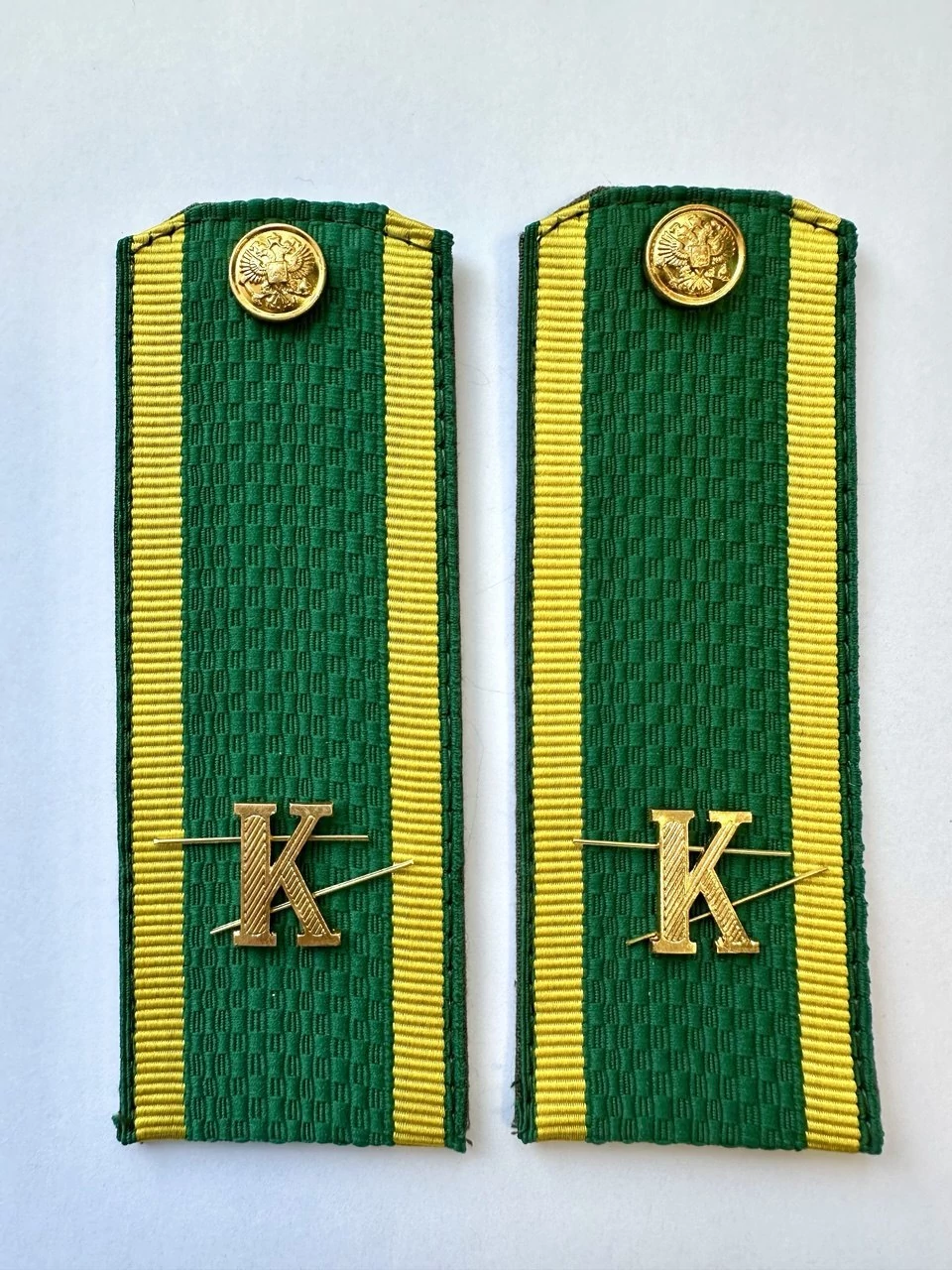 Размер 13,5 см. Погоны К курсантские изготовлены в форме прямоугольника, верхние края имеют форму трапеции. Подложка выполнена из картона, который защищает изделия от деформации во время носки. Для крепления погон к форме на изнаночной стороне пришита шлевка из ткани. Лицевая поверхность обстрочена тонким шелковым галуном. Кадетская и курсантская форма.