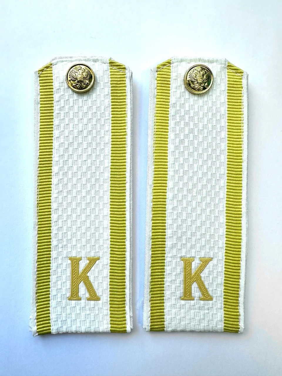 Погоны МО курсантские К белые 13,5 см, пуговица закреплена на погонах как на фото (реквизит).