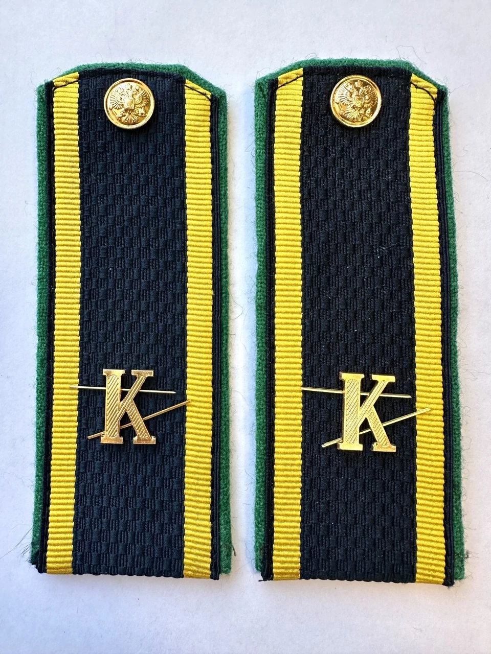 Погоны ПС ФСБ курсантские К темно-синие, зеленый кант, 14 см картон, металлические буквы К в комплекте, пуговица закреплена на погонах как на фото (реквизит).