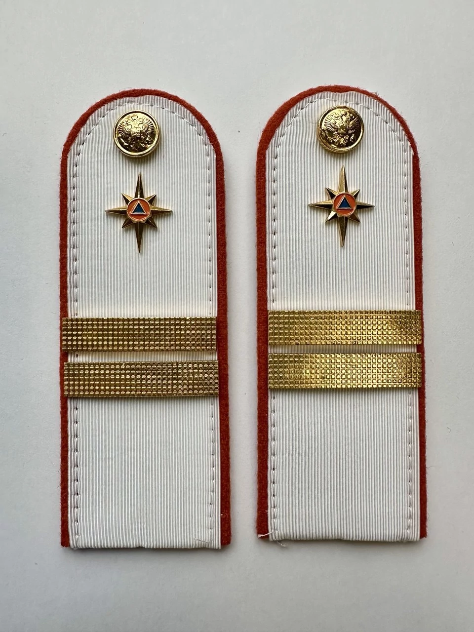 Погоны МЧС на рубашку 14х5 см (в сборе) укомплектованные с фурнитурой. Основа: КАРТОН. Материал: Погонная лента (полиэстер 100%). Ведомство: МЧС. Цвет: белый (уставной МЧС), Оранжевый. Погоны МЧС изготовлены в форме прямоугольника, верхние края которого закруглены. Подложка выполнена из картона, который защищает изделия от деформации во время носки. Для крепления погон к форме на изнаночной стороне пришита шлевка из ткани. Лицевая поверхность обстрочена красивым тонким шелковым галуном цвета морской волны. Окантовка погон выполнена в оранжевом цвете.