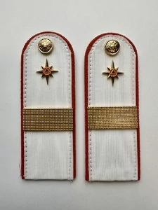 Погоны на рубашку 14х5 см (в сборе) укомплектованные с фурнитурой. Основа: КАРТОН. Материал: Погонная лента (полиэстер 100%). Цвет: белый, Оранжевый. Погоны изготовлены в форме прямоугольника, верхние края которого закруглены. Подложка выполнена из картона, который защищает изделия от деформации во время носки. Для крепления погон к форме на изнаночной стороне пришита шлевка из ткани. Лицевая поверхность обстрочена красивым тонким шелковым галуном цвета морской волны. Окантовка погон выполнена в оранжевом цвете.
